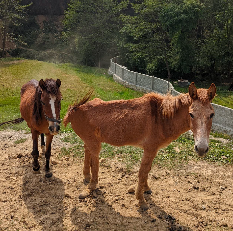 Since coming to Animal Nepal’s sanctuary, Jackie has really transformed! Although he was not accepted into the herd, Jackie is a very happy mule and he spends all his time with his beloved best friend, Paulie, a female horse.