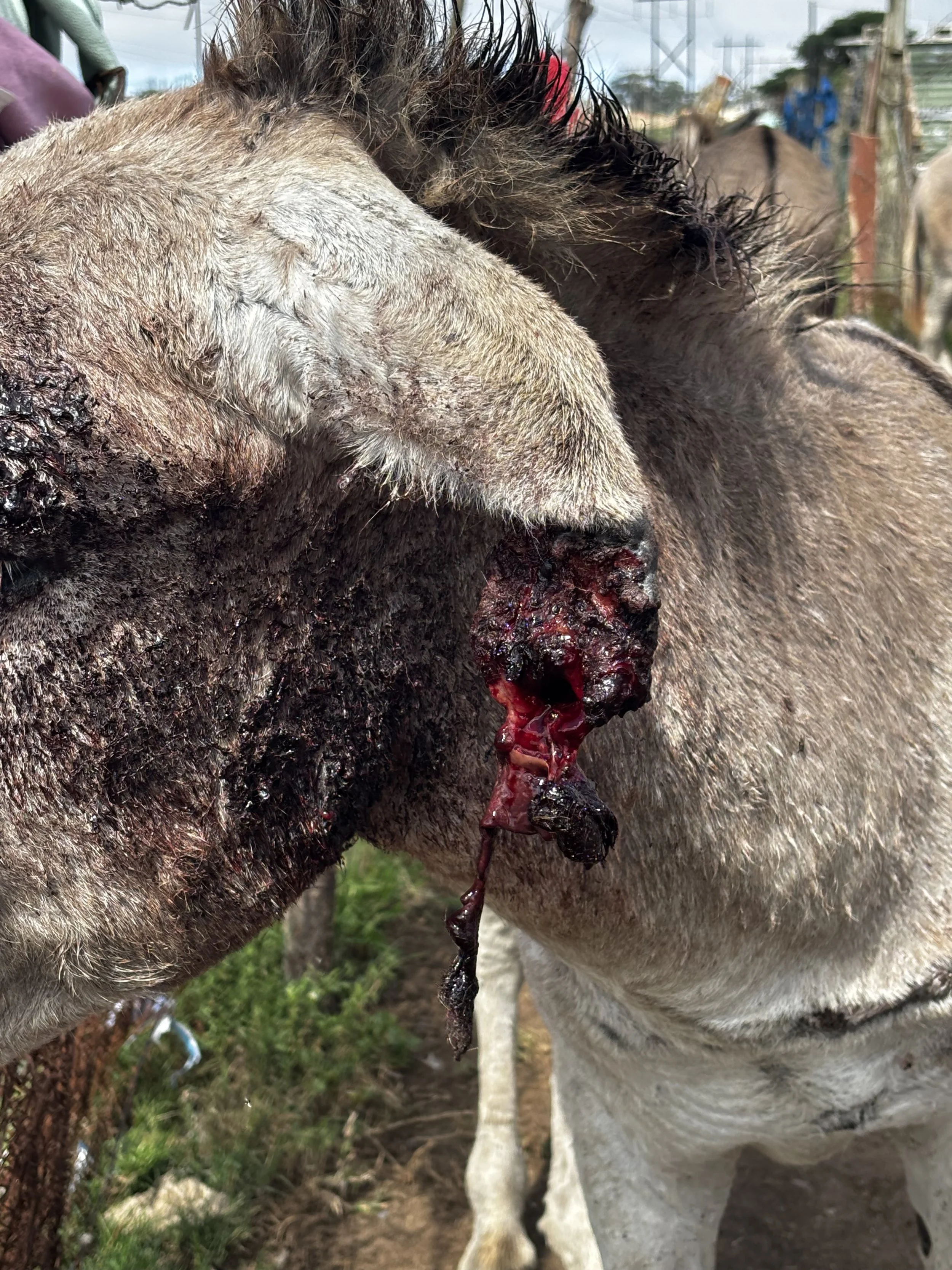 Malema, a donkey previously treated for a stab wound, returned with deeper tissue infection. He was admitted to the Care Station for daily wound flushes and hygiene care. Thanks to intensive treatment, Malema is now healing well.