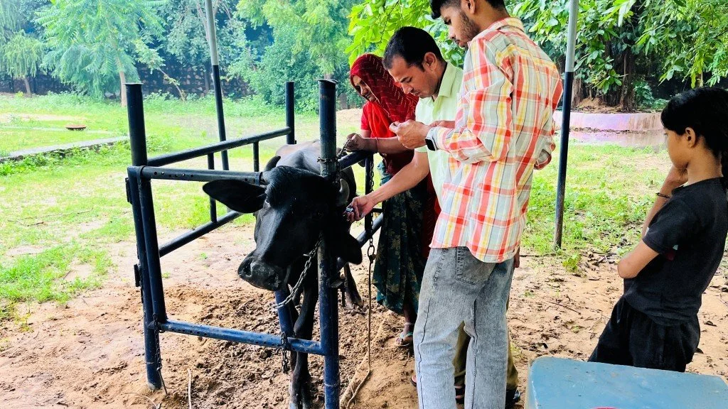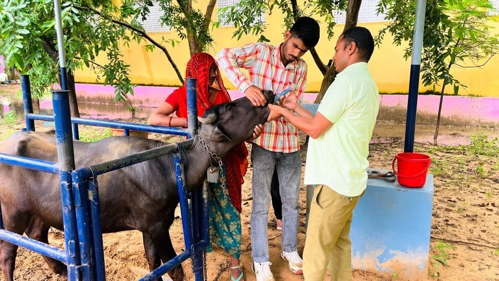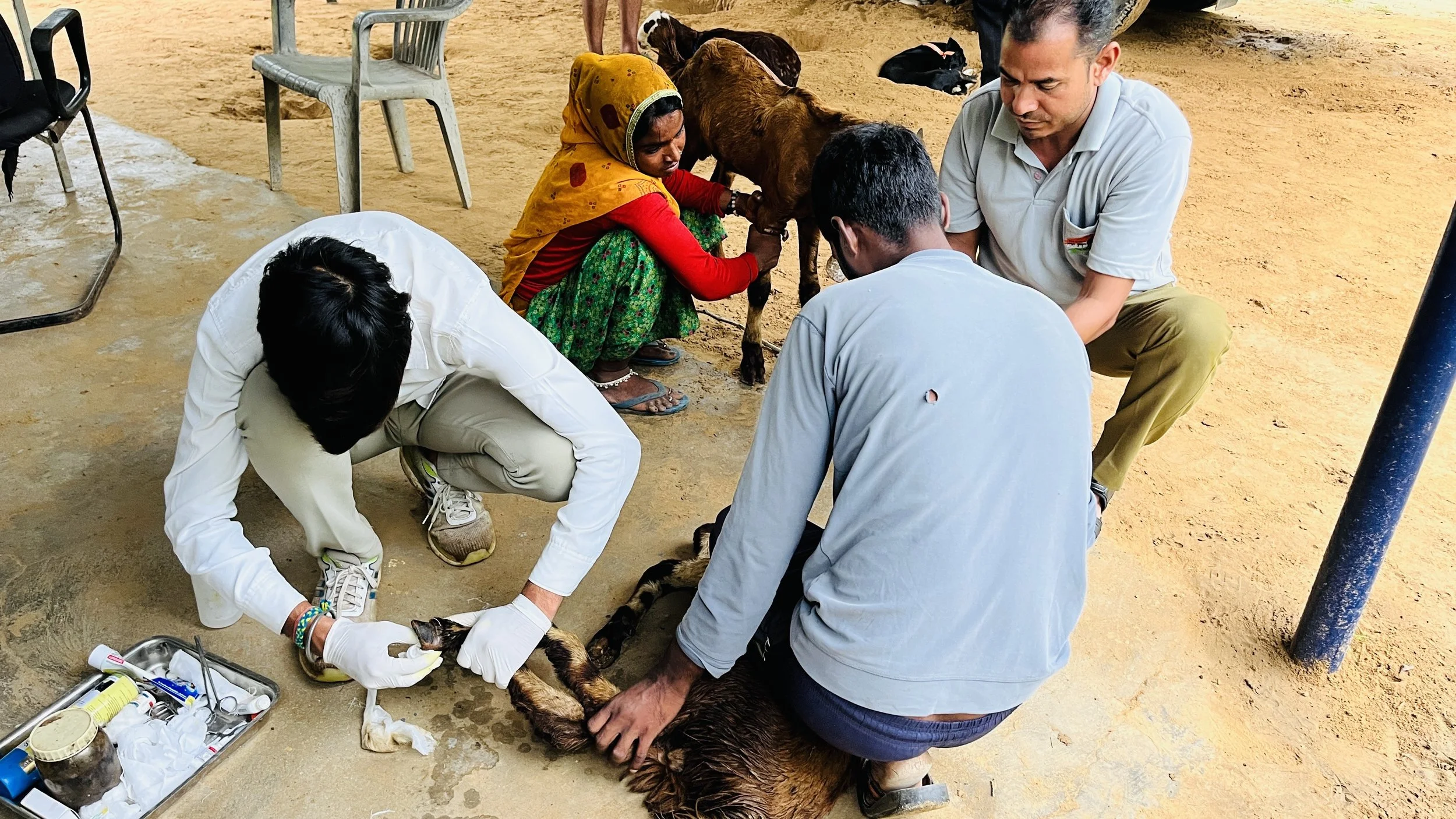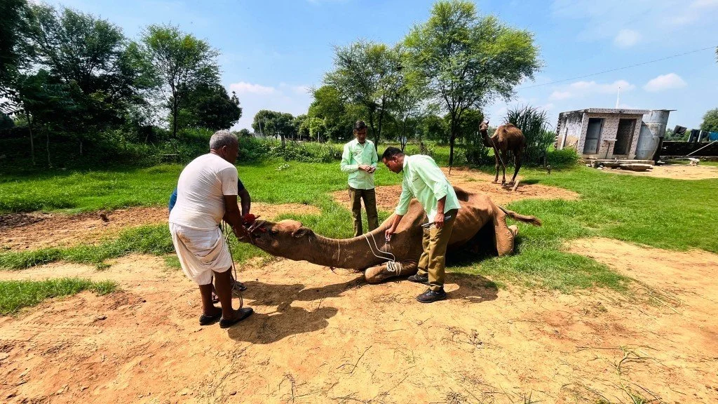 At our site in Kothkhawda, Megharam brought his camel along as she had not been eating properly. The camel was very dull and depressed and showing slight abdominal colic. Upon examination, Dr Himanshu found the camel’s condition was alkalosis. He started treatment with fluid and other medicines.