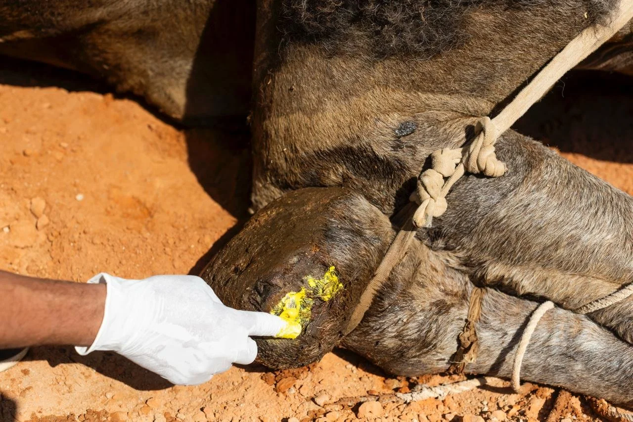 A few days later, swelling developed on the side of the foot pad. The owner ignored it and the camel continued working. Eventually, pus started oozing from the wound, and the camel showed slight lameness and difficulty carrying heavy loads. The owner called our mobile ambulance for help.