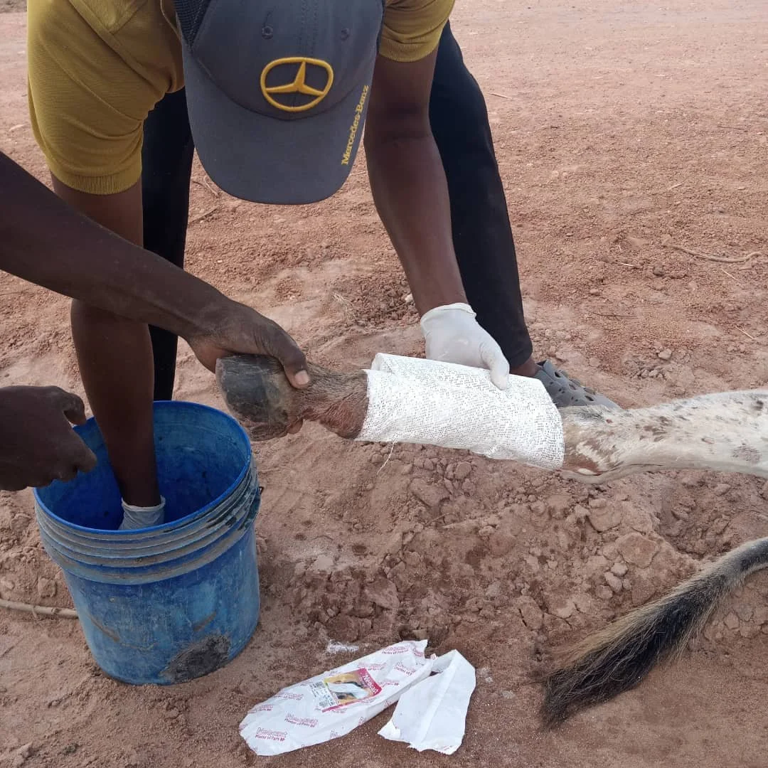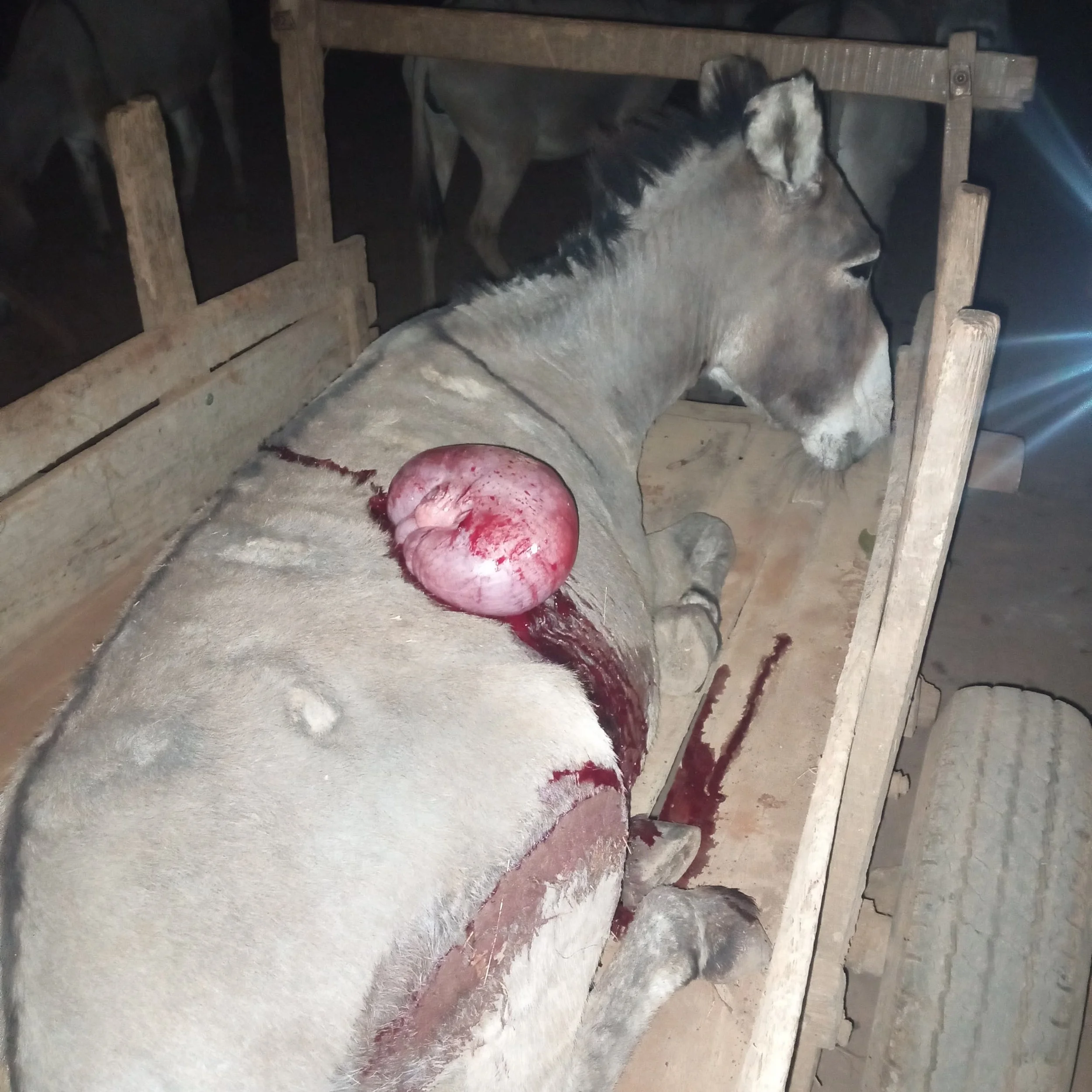 We received an urgent call from a donkey owner in Stamico that his diligent donkey, Mashabala, was in severe distress after sustaining a hind limb fracture. While pulling a cart loaded with stones at a gold sand excavation site, a large stone accidentally fell and struck Mashabala’s right hind limb, leaving him in pain and unable to bear weight.
