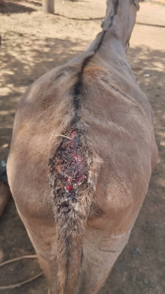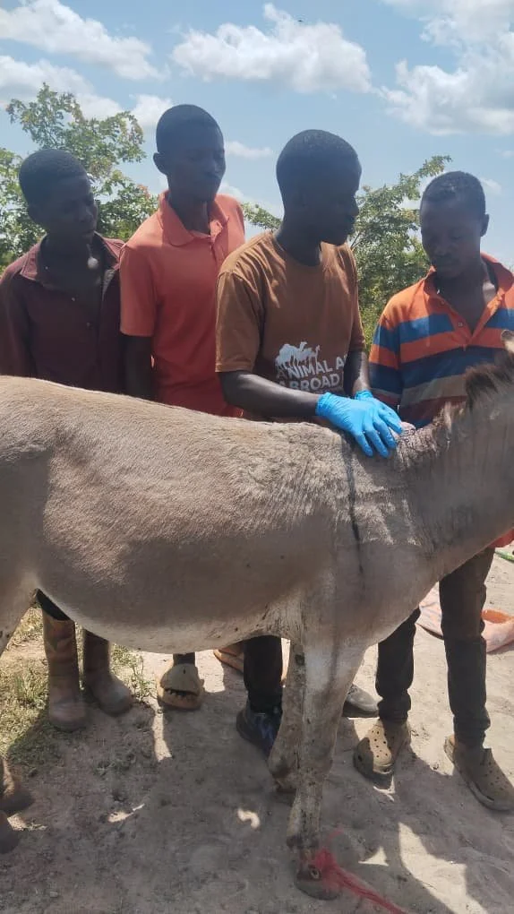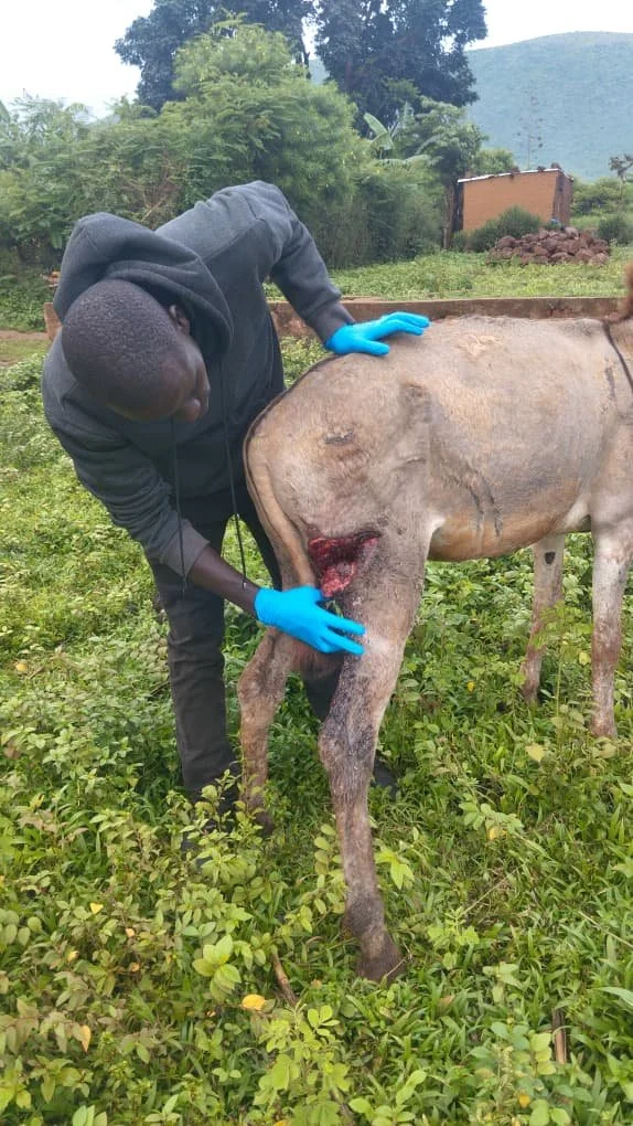 In January, the LAZAWO team was urgently informed about a donkey in Mgusu who appeared to have been severely cut by a sharp object. When the team arrived, the donkey, Sahei, was found in extreme pain, exhausted, and unable to move. His quietness reflected prolonged suffering.