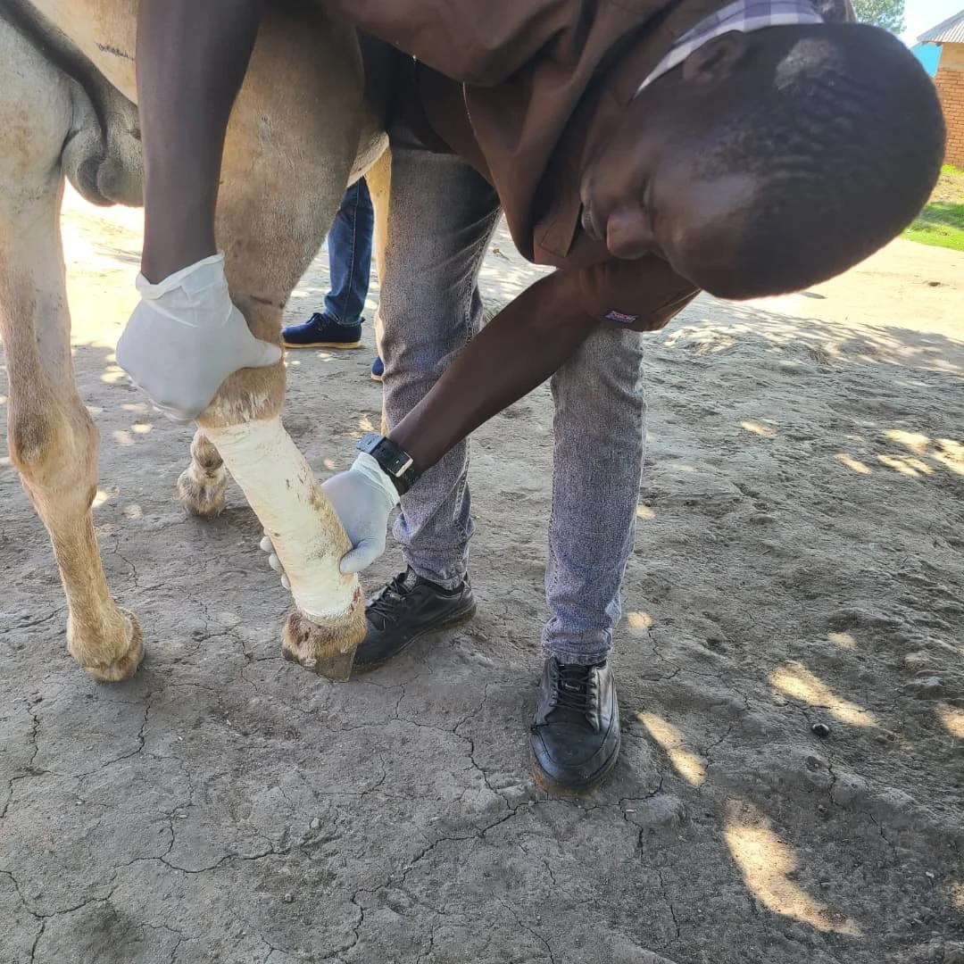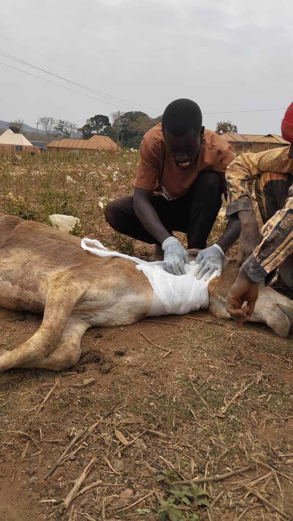 When we arrived, Masanja was lying helpless, his neck painfully twisted, his body weak and trembling. Moved by his suffering, our team acted swiftly by administering sedation, carefully realigning his neck, and securing it with splints and bandages to ease his pain.