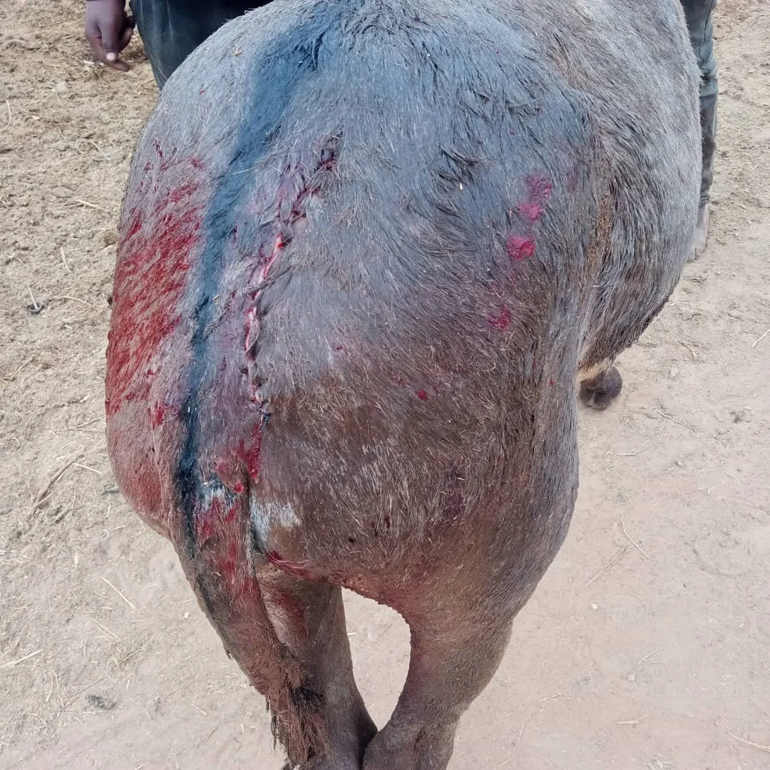 In September, Sajo - a loyal working donkey from Magenge - sustained a devastating and painful injury while performing his daily duties at an ore-loading site. During a shift change, a loading attendant accidentally threw a spade, which struck Sajo in the gluteal area and caused a deep wound.