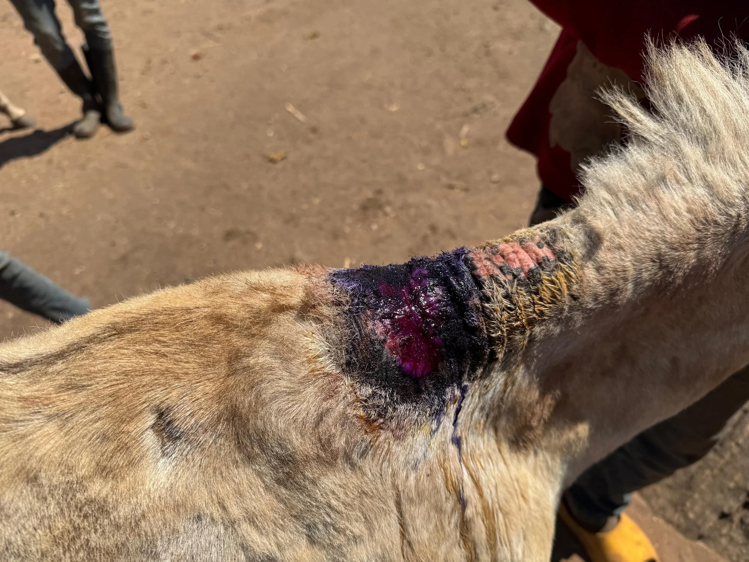 During this clinic, a donkey called Ukali was presented for treatment. Ukali appeared depressed and reluctant to move, with a severe neck wound caused by a combination of a worn-out yoke and overwork, which was further aggravated by a rope used for restraint.