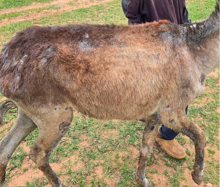 A donkey presenting with poor coat condition, with the owner reporting ongoing fly infestation challenges in Mngwangwa