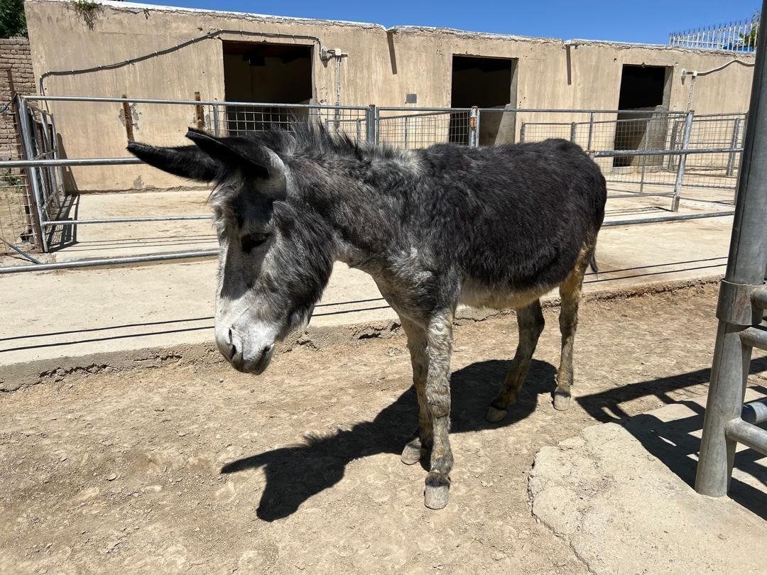 He is very nervous and will become quite aggressive if he feels threatened by other donkeys. However, he has befriended Aussie, who was rescued in 2021, and tends to seek him out when all the animals are in the exercise yard.